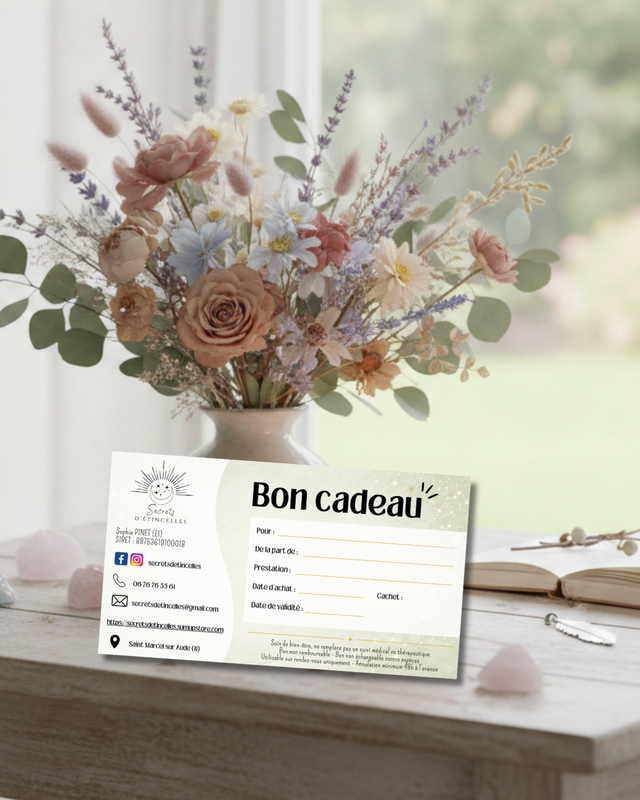 Avec le Bon cadeau – Soin énergétique, vous offrez une véritable parenthèse de douceur : un temps de reconnexion à soi, d’apaisement et de rééquilibrage énergétique 💫